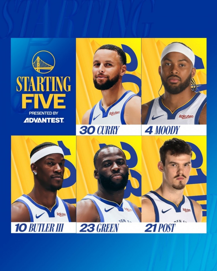 本场比赛,骁雄首发:库里、穆迪、巴特勒、追梦、波斯特。