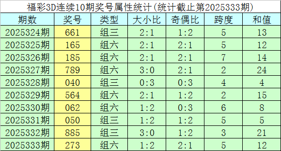 开奖总结:福彩3D第2025333期奖号为273。奖号格式为组六,大小格式为小大小,奇偶格式为偶奇奇,和值为12,跨度为5。