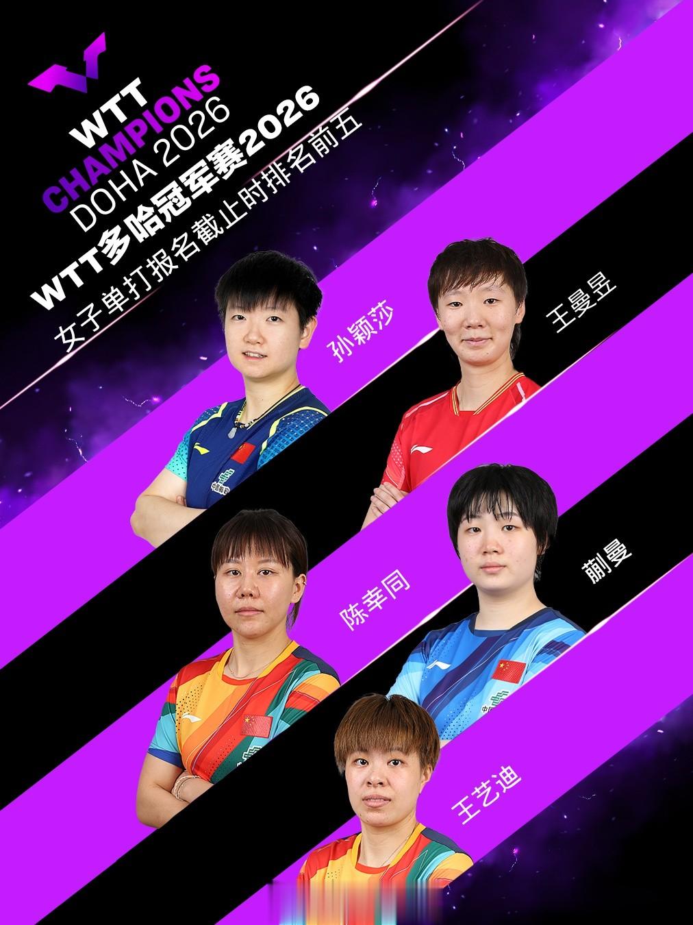 一场是WTT多哈冠军赛,本事为2026年1月7日至11日,在卢赛尔体育馆举办,本站赛事冠军将取得1000点寰宇名次积分。