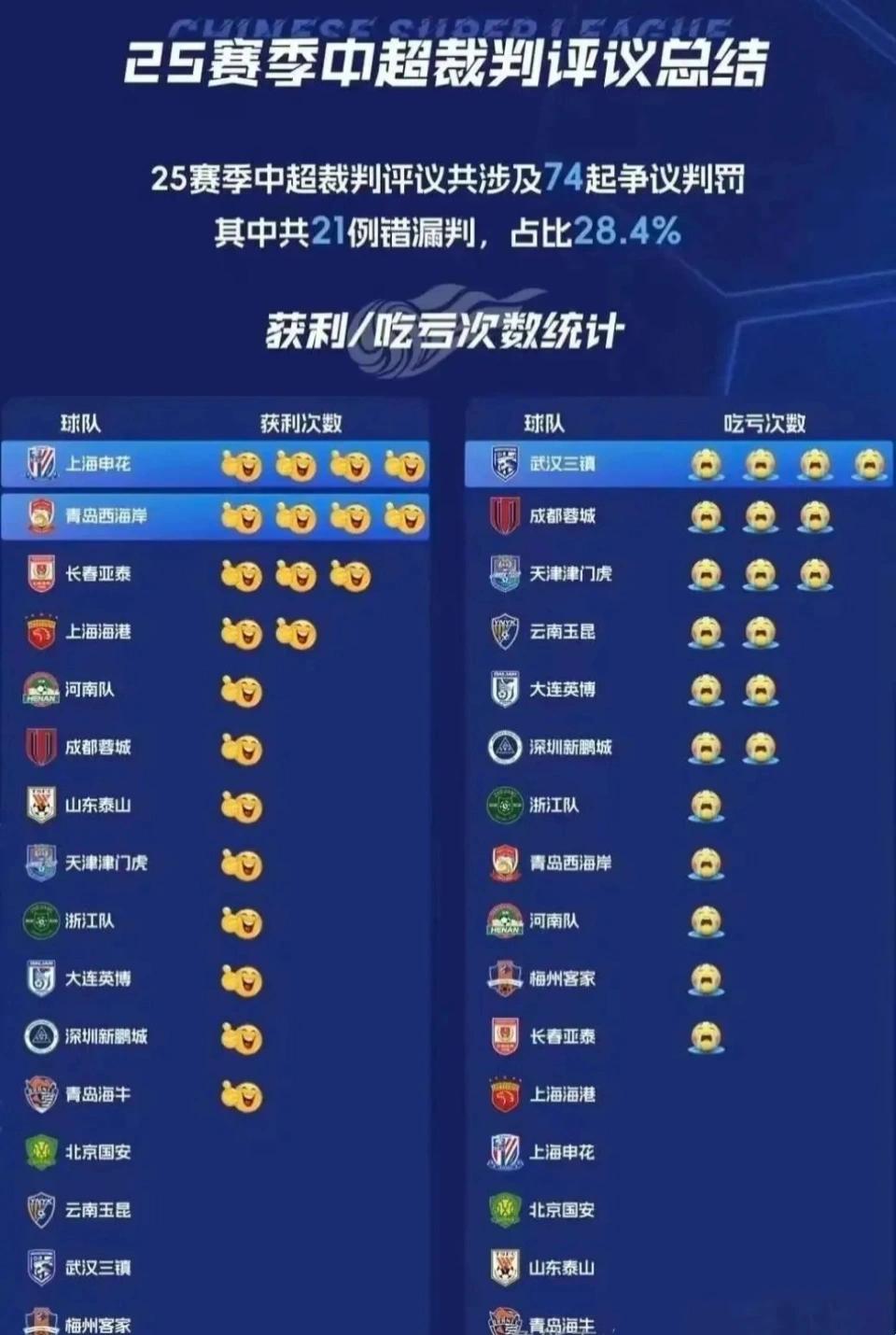 在联赛禁止之后,球迷评比出的一份对于判罚问题的榜单成为了外界心计的焦点,这份榜单便是各队“赢利”与“去世”次数名次。这两份榜单的统计依据,是本赛季各队针对74次争议判罚发起的陈述。经裁判评议组评议,其中21次被认定为误判,“赢利”与“去世”情况便从这21次误判中梳理得出。从效劳来看,上海申花和青岛西海岸并排“赢利榜”榜首,均赢利4次。