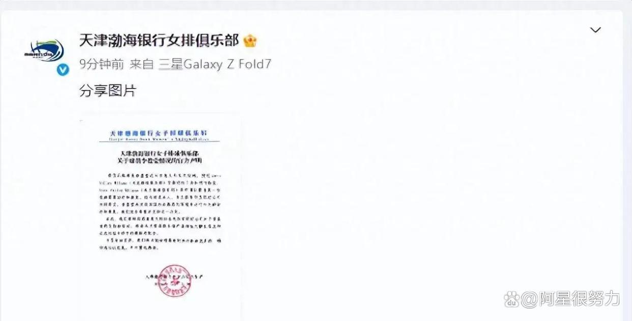 (参考信息起原:天津渤海银行女子排球俱乐部对于球员李盈莹情况的官方声来日津渤海银行女排)