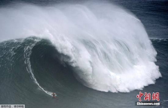 贵府图:葡萄牙莱里亚区纳扎尔举行巨浪冲浪挑战赛,夏威夷的冲浪达者Kai Lenny在风急浪高的北滩冲浪,惊恐刺激的挑战眩惑繁密游人围不雅。