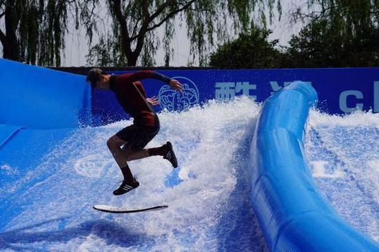 “它是有两个板子的遴荐。一个是站板。站板顺应年青人、可爱挑战的人或者说玩过滑板、尾波、滑雪的人。小一又友可以玩趴板,上手相对容易一些。”刘泫圻说。“这项畅通,念念初学不难,从小学生一直到五十多岁的人都有(来体验)。”