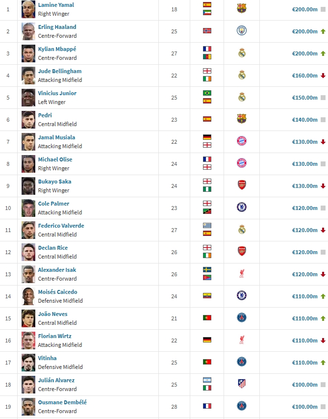 本日德转更新意甲球员身价,至此五大联赛齐完成了这个周期的身价更新,让咱们来望望当今足坛的亿元先生们。