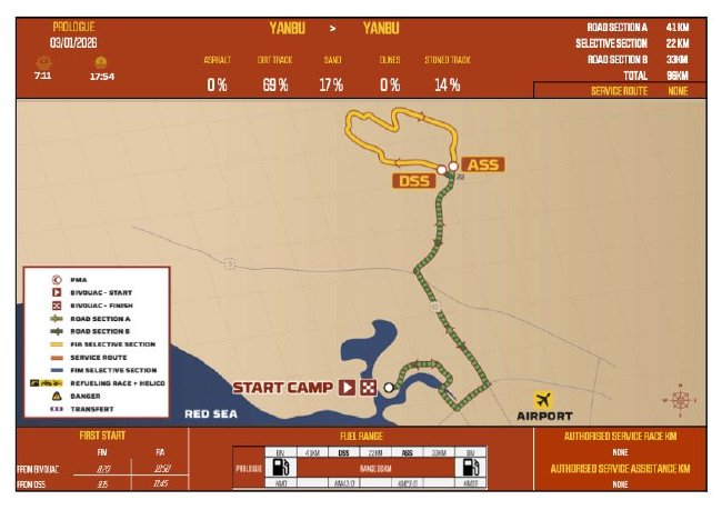 今天的揭幕赛收获也将会决定车手们翌日第一赛段的发车位顺位;今天收获越靠前的车手,有优先决定我方发车顺位的权益。摩托车组和汽车组今天的赛段总长都为73km,其中22km为罕见赛段。