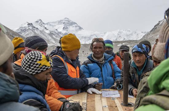 格桑(中间穿蓝色羽绒服者)和其他村民一齐商讨将光纤运输到海拔6500米前进营地的环节。