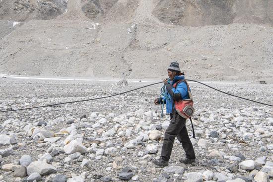 格桑和其他村民一齐正在将光纤运输至前进营地的路上。