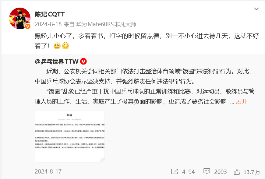 2024年,陈玘曾转发一条中国乒协就“公安机关会同干系部门照章打击整治体育边界‘饭圈’罪犯作歹动作”的声明,并配文“黑粉儿提神了,多望望书,打字的时辰留点德,别一不提神进去待几天,这就不面子了!”